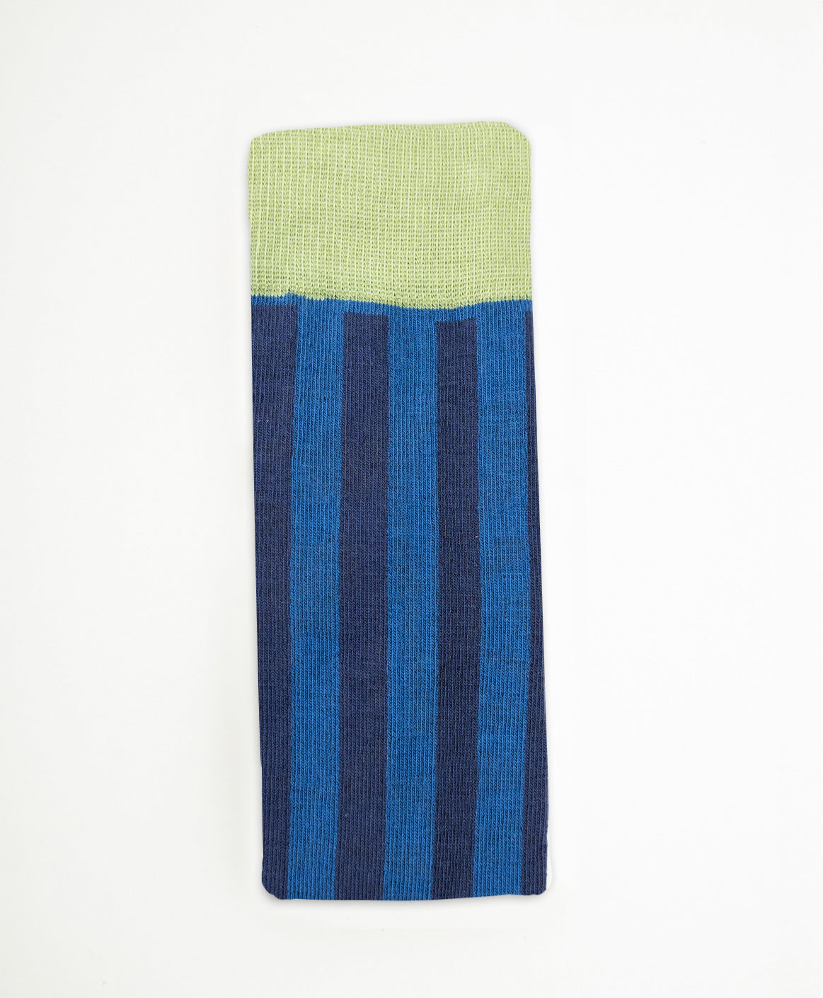 Calcetín de caña alta con rayas verticales azul marino y azul más claro.