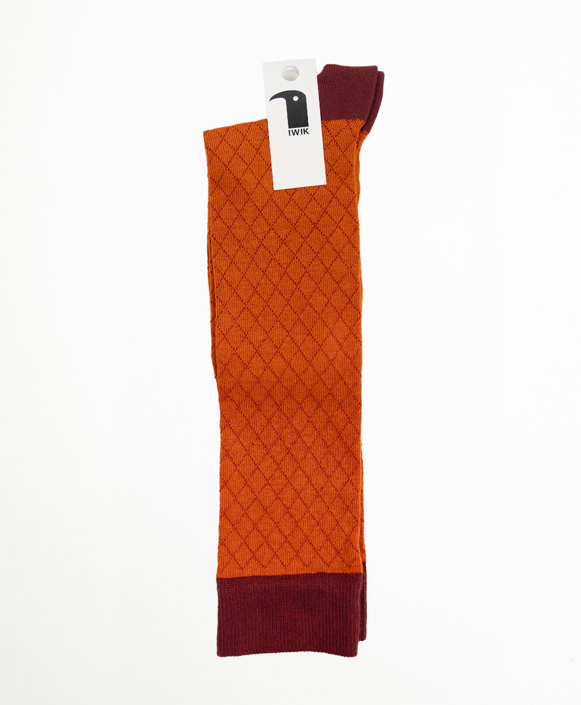 Calcetín de caña alta de rombos naranja con fino pespunte burdeos.