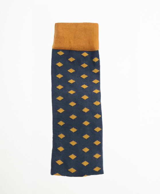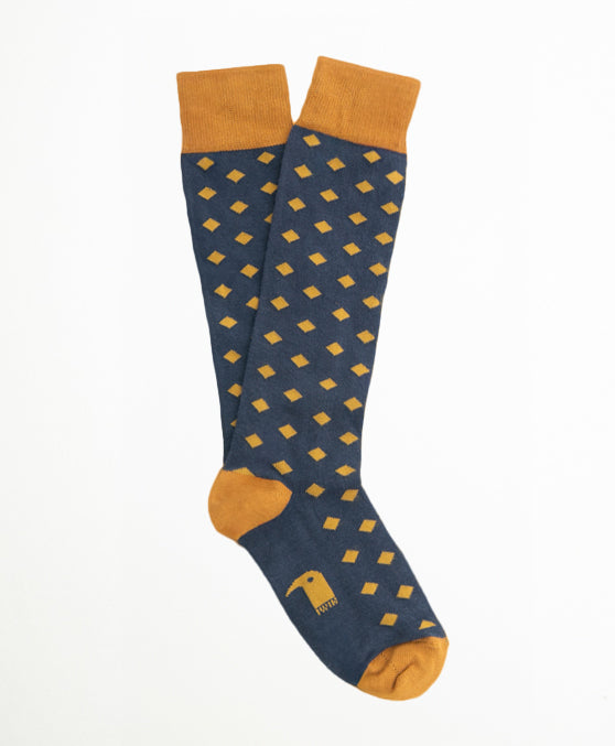 Calcetín de caña alta algodón azul marino con pequeños rombos mostaza.