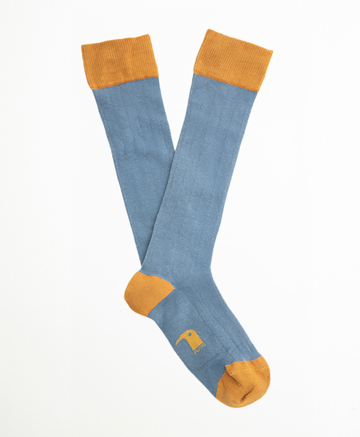 Calcetín de caña alta algodón de canalé liso celeste y mostaza